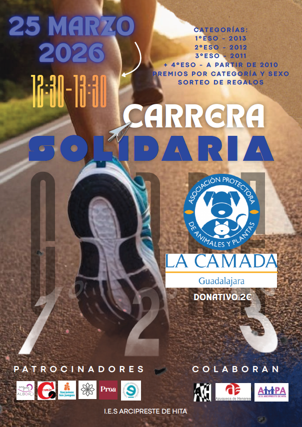 Carrera Solidaria Publicado el 6 de marzo de 20266 de marzo de 2026 Ya está aquí nuestra carrera solidaria de todos los años, se celebrará el 25 de marzo Publicado en PES, Proyectos.